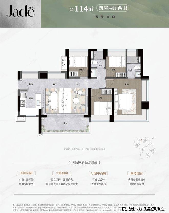 114平㎡的4房2厅2卫,设计的是横厅南北通透格局,进门入户玄关,LDKB一体化,五开间朝南,全屋9面飘窗,主卧大套间,U型厨房,卫生间干湿式分离,得房率约93.18%(包含赠送),阳台主朝东南向。
