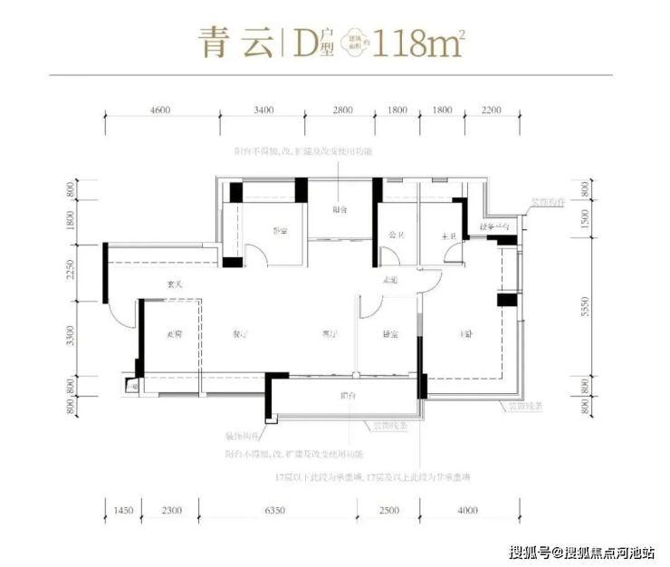 118㎡的4房2厅2卫,设计的是横厅南北通透格局,进门赠送约4.6㎡的入户玄关(不计算在户型图内),客餐厅6.35米开间,LDKB一体化设计,4个卧室分别做到了主卧22.5㎡/次卧11.56m²/次卧9.52㎡/次卧8.25㎡(包含墙体飘窗),主卧带设备平台,客厅连接次卧出6.25米长大阳台,L型厨房,得房率约81%(不含赠送),阳台主朝东南向。套内面积95.58m²+赠送面积31.04m²=实际使用面积126.62m²,加上赠送后得房率约107.3%。