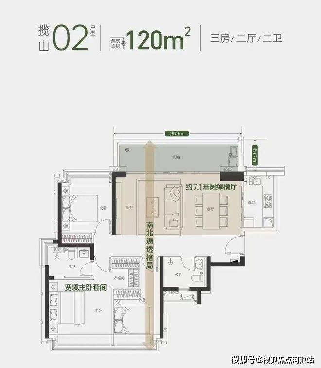01/02户型约120㎡3房2卫横厅:客厅阳台超7.1米,尺度很大,看向小区园林以及塘朗山山景,动静分离,户型方正视野开阔,属于居住体验非常阔绰的房型。约120平房源的北向视野,从2层开始就是满目的郁郁葱葱,20层以上俯瞰整个塘朗山,东南向视野更是集山景与繁华城市于一身。