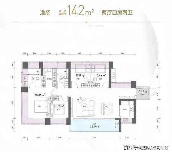 142㎡的4房2厅2卫,2栋1/2/3单元02户型,设计的是横厅南北通透格局,独门独户,赠送约4.37平的入户空间,客餐厅7.3米开间,LDKB一体化设计,五开间朝南,主卧带大衣帽间,分别做到了主卧30.05㎡/次卧10.8㎡/次卧10.44㎡/次卧9.52㎡(包含墙体飘窗),客厅连接次卧出6.9米长的大阳台约12.42平,U型厨房,卫生间干湿分离,得房率约104.2%(包含赠送),西南或东南朝向。飘窗赠送面积23.8㎡+阳台赠送6.21㎡+外廊赠送4.37㎡=实际赠送34.38㎡。