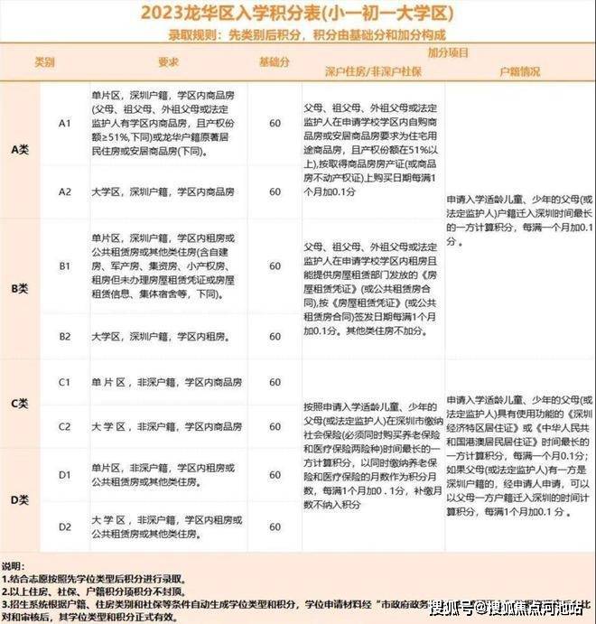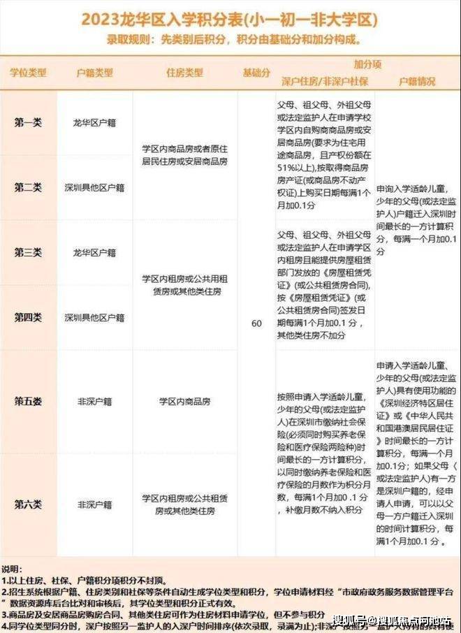龙华区积分入学政策:深户=基础分+住房分+父母户籍加分;非深户=基础分+社保分+父母户籍/居住证加分