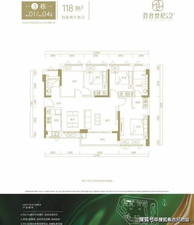 118㎡的4房2厅2卫,3栋1单元04/3栋2单元01户型,设计的是竖厅南北通透格局,进门入户玄关,客厅4.15米开间,客餐厅分离设计,南北双阳台,得房率约76%(不含赠送),阳台主朝西南或东南向。套内面积89.68㎡+赠送15.44㎡=105.12㎡,加上赠送得房率约89.08%。