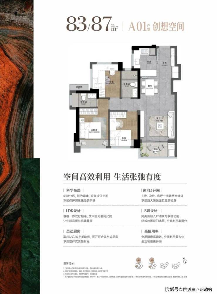83-87㎡的3房2厅2卫,经典竖厅格局,客厅实测3.14米开间,LDKB一体化,S墙设计预留冰箱卡槽位,三开间朝南,U型灵动式厨房,卫生间干湿分离,得房率约76-81%(不含赠送),西南朝向。