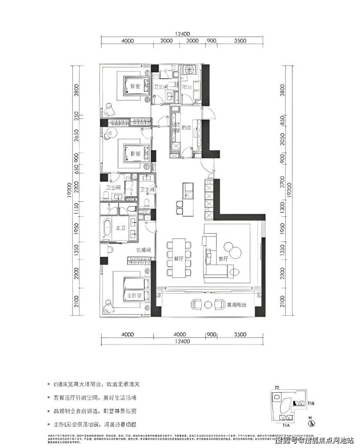 280㎡三房两厅四卫:位于1栋三、四单元24-32层,为05、08户型。拥有超8米超宽幕开间,厅出阳台可直面海景。采用三套房设计,主卧配备L形全景落地窗,占据270°最佳观海位。