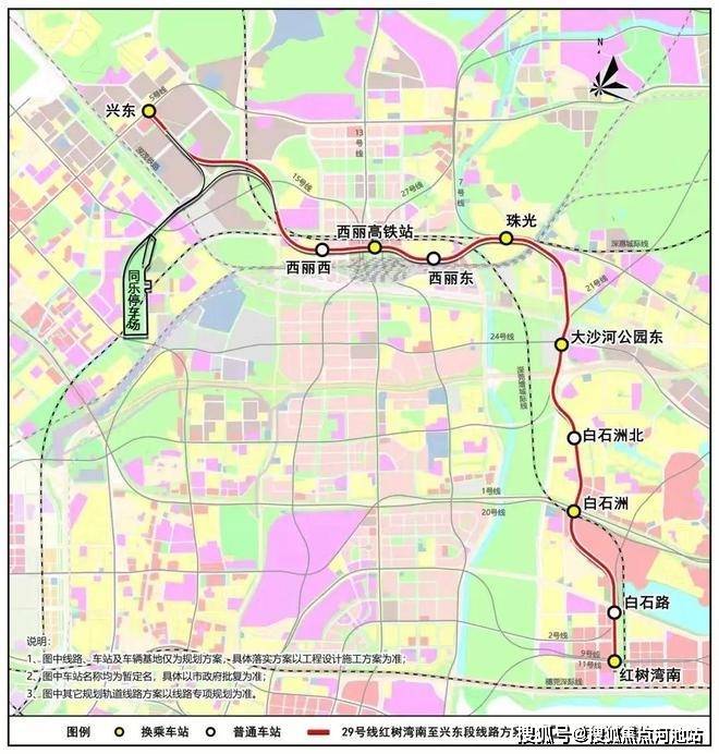 29号地铁线:该线路为南山至光明的普速线路,主要功能为带动沿线城市组团重点片区高质量发展,设计时速80公里,共分2期开发,其中1期兴东-红树湾站已经动工,共设站10座,全线长约11.3公里,建设周期为2023-12-30至2028-12-28;2期是途径石岩,终至科学公园站。
