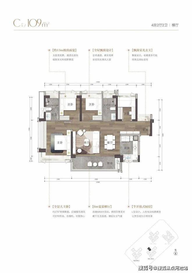 建面约109㎡的户型:横厅设计,三面采光,大阳台,整体上通透性、观景体验更好,空间实用率更是高达96%!