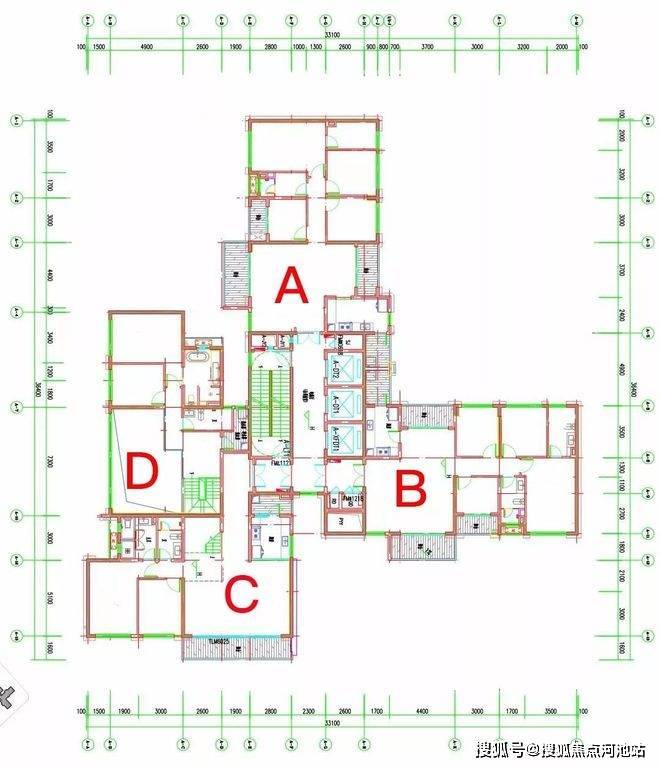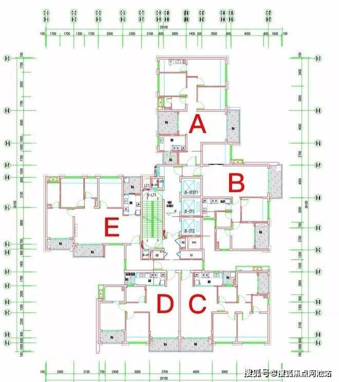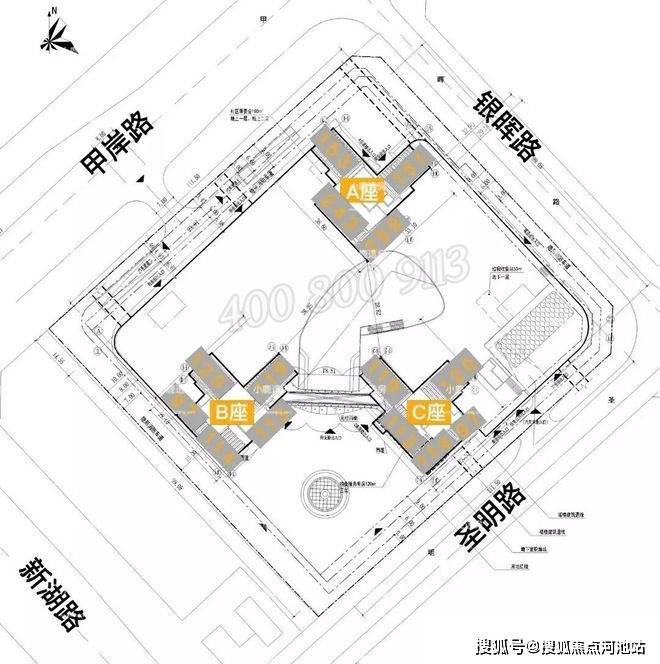 项目三栋住宅均为塔楼设计,A座三梯四户,B座、C座均为三梯五户,各栋户型分布平面图如下: