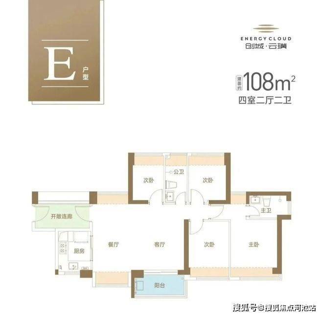 -108㎡4房2厅2卫:设计的是横厅南北通透格局,客餐6.2米开间,U型厨房,卫生间干湿分离,有额外赠送一大块入户花园,阳台主朝东南向,仅有2栋4单元03户型才有这个面积段户型。
