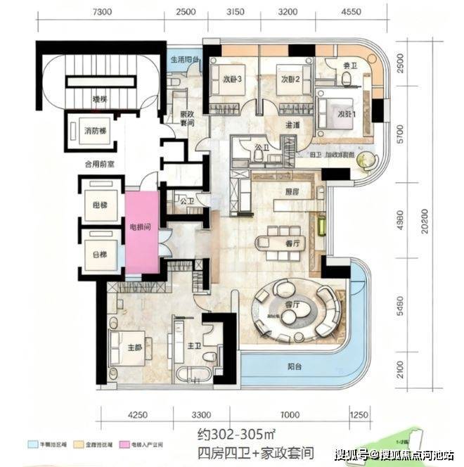 305㎡以上的户型做到了南北通透板楼设计,户型类似于前海时代三期大平层,厨房公卫在中间,客厅和卧室分区动静分离,做到了4房4卫+保姆间。