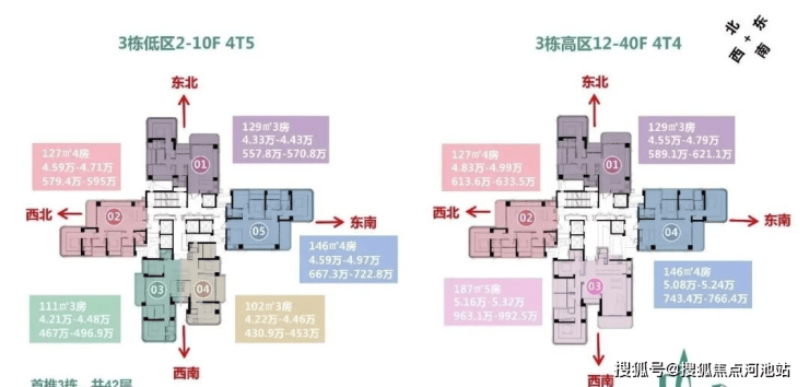 另外,约129平米、折后总价低于600万的高区户型,主要分布在10楼到26楼;600-622万区间的同户型,则分布在高区28-40楼之间。