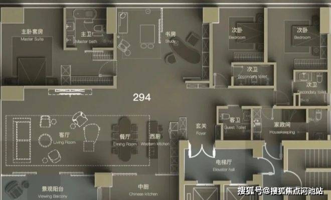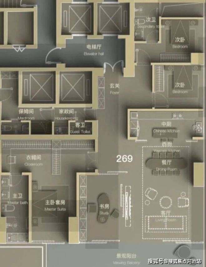 高区(42层起,150-200米):约370-403㎡,4+1房设计,配备家庭厅及家政套间;