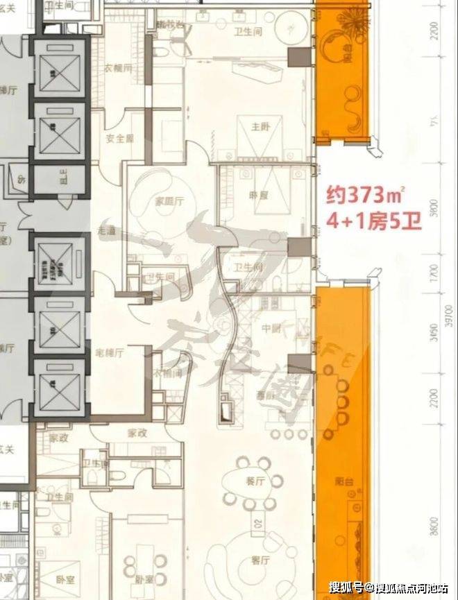 · 高区42F起(150-200米)是约370-375-403㎡4+1房五卫+家庭厅+家政套间;