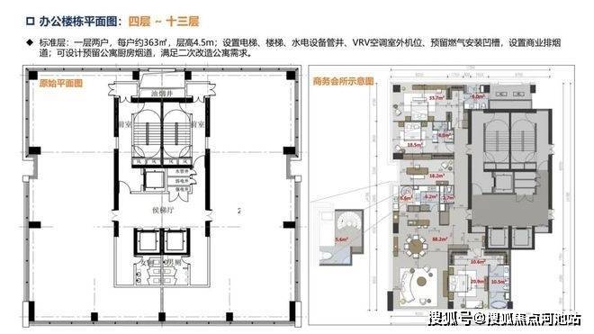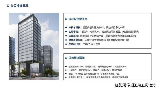 办公楼:层高约4.5米,两梯两户,单套270°三面采光环幕山海城港景观,14楼顶层复式,电梯可上15层。