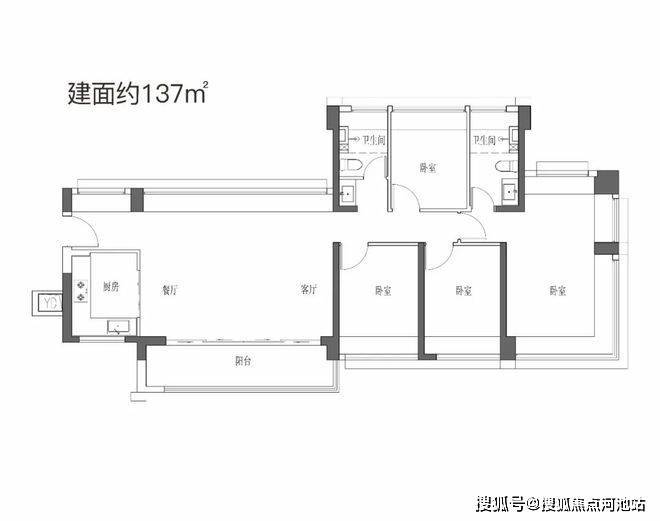 137㎡的4房2厅2卫,设计的是横厅南北通透格局,进门入户玄关,LDKB一体化设计,超宽展面,动静分区,五开间朝南,主卧三面观景飘窗,L型厨房,公卫三段式分离,得房率约90%(包含赠送),阳台主朝东南向。