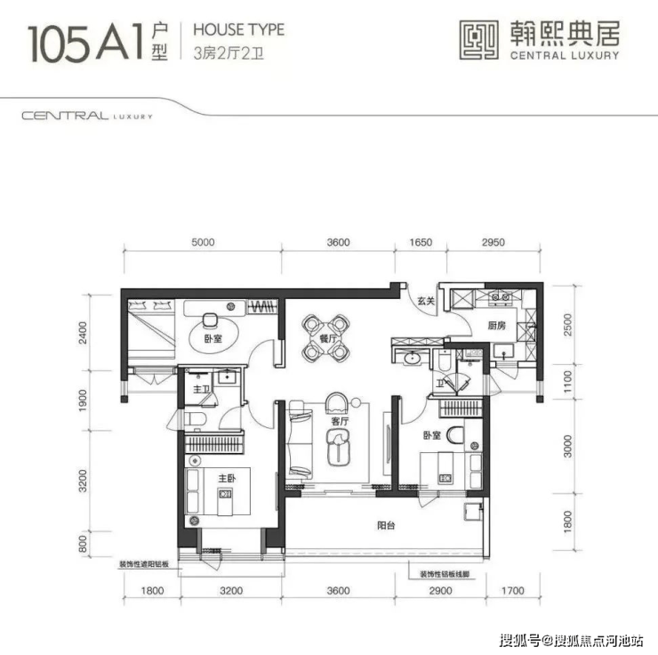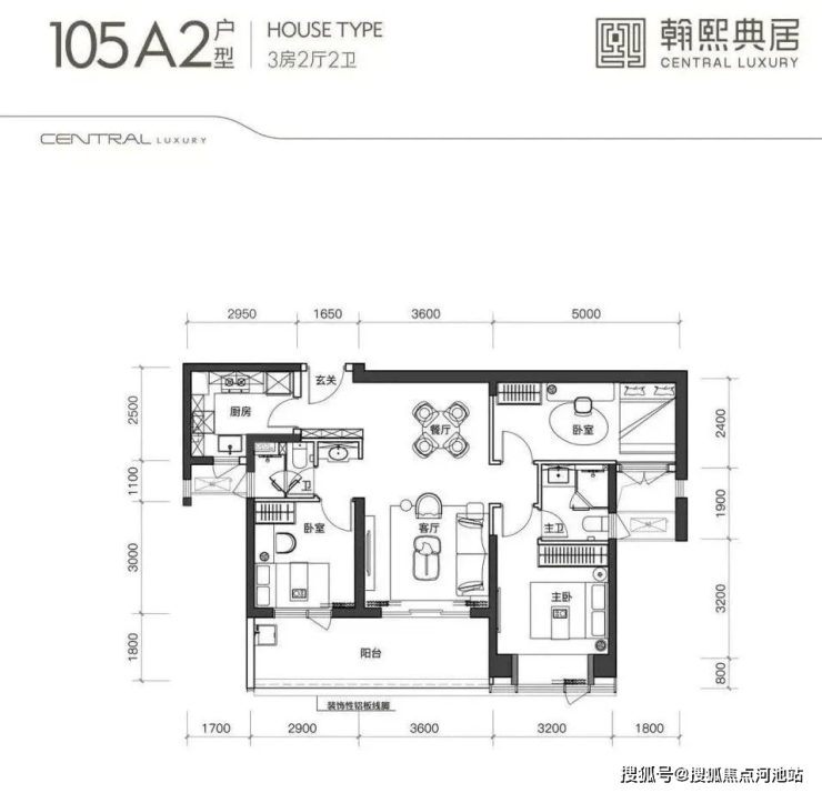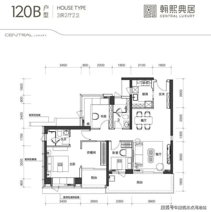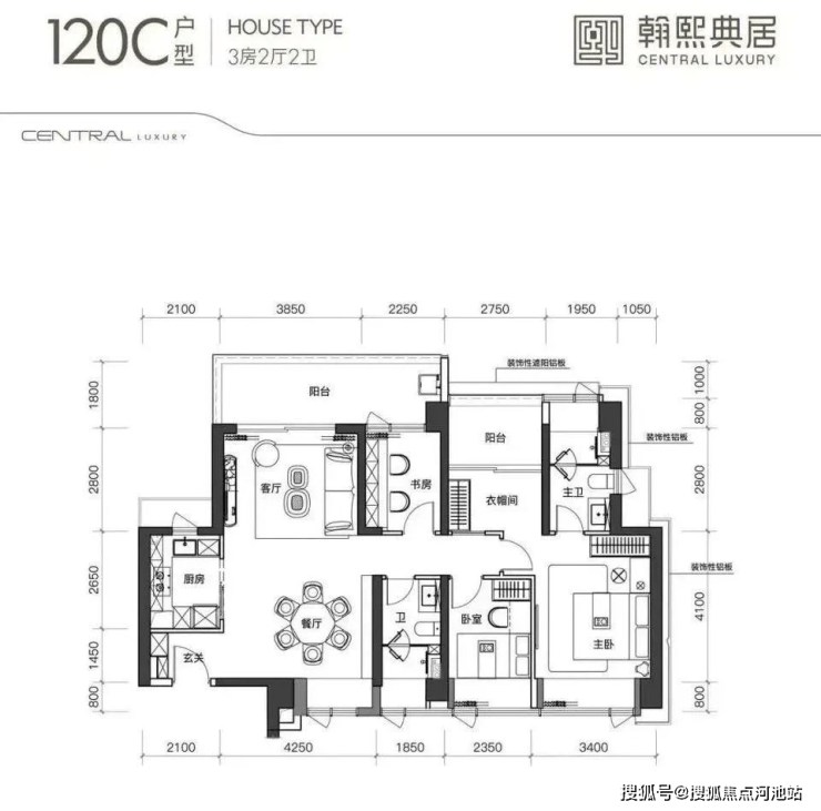 经典的双龙抱珠布局,主人空间与客卧空间互不干扰,具备私密性优势。并且户型方正,实用三房两厅两卫。朝南向四开间面宽共约 13.2m,全明空间,采光极佳。这个户型含赠送半阳台和飘窗的面积后使用率可达约 83%,这在超高层中是比较高的使用率。