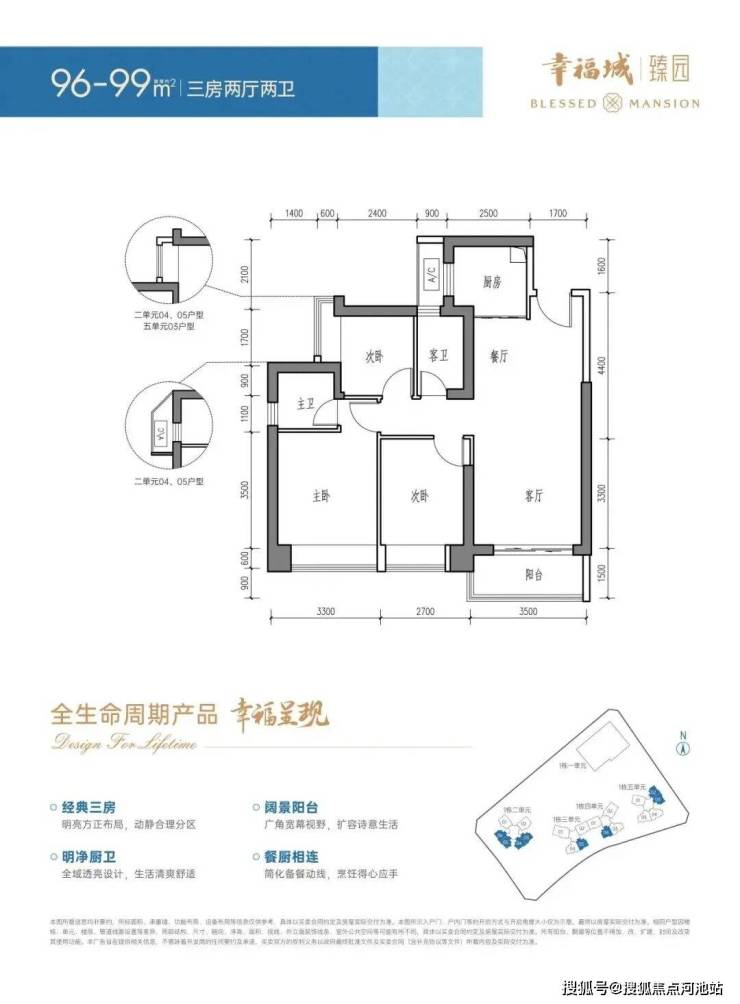 96-99㎡的3房2厅2卫,折后总价399-480万/套,单价4.11-4.85万/㎡