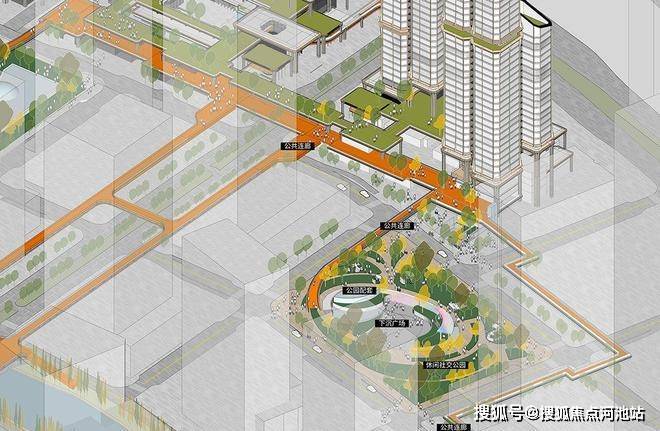 以既有空中连廊系统为基底,向北延伸公共步道,贯通南北口袋公园。整合首层、二层及地下慢行系统,形成四维立体通廊,将住区纳入更广阔的城市公共网络。