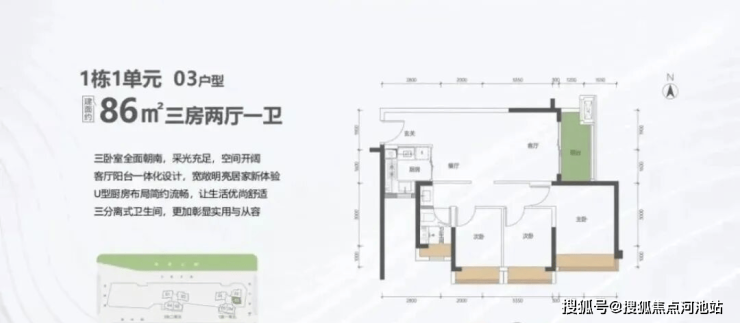 86㎡的3房2厅1卫,1栋1单元03户型,设计的是竖厅格局,客厅3.5米开间,LDKB一体化设计,进深10.05米,主卧全朝南,动静分区,3个卧室分别做到了主卧11.67㎡/次卧8.64㎡/次卧8.46㎡(包含飘窗),U型厨房,卫生间三段式分离,得房率约:80%(不含赠送),阳台5.5㎡东南朝向。套内面积68.8㎡+赠送面积8.5㎡=实用面积77.3㎡,加上赠送后得房率约89.88%。