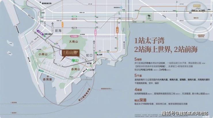 项目位于2号线和5号线交汇的赤湾地铁站,项目紧邻赤湾站——2号线与5号线的交汇站,距离项目2km范围内还有在建地铁12号线左炮台站,同时片区内还规划有地铁28号线,未来公共交通发达。同时,项目可通过小南山隧道或港航路汇入兴海大道,连通前海、后海、宝中等区域。