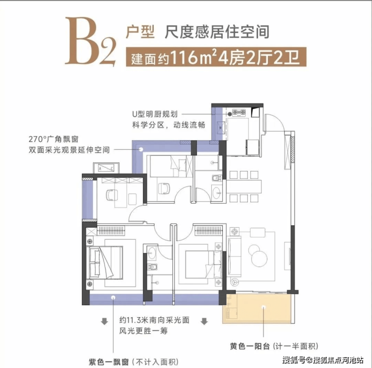 建面约116㎡竖厅4房2厅2卫,非常理想的4个房间的布局,4开间朝南向。几乎每个房间都是满开间的飘窗增加使用率,次卧还可以做270度的一个转角飘窗,实现双面采光,主要就是配置了一个多功能的套房设计,居住更舒适。