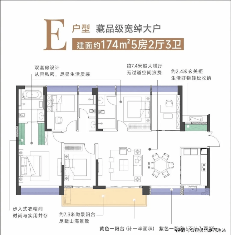 建面约174㎡横厅5房2厅3卫,同样做到五开间朝南向,夏天享清风,冬日晒暖阳。还享有约7.3米超长阳台,搭配约7.4米超大横厅,会客休闲气度十足,观景远眺一览无余。奢侈双主卧套间设计,保障熟人私密性,尊重并平衡两代的生活习性。