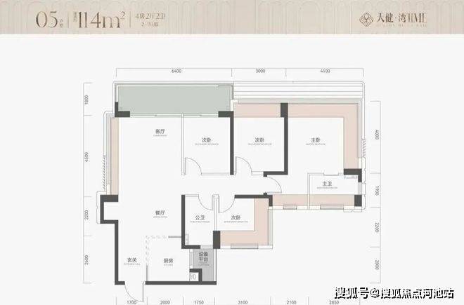 114㎡4房2卫,竖厅户型,朝北对着金众,户型结构和113完全一样,就是客厅也做了一面4.5米宽的凸窗;