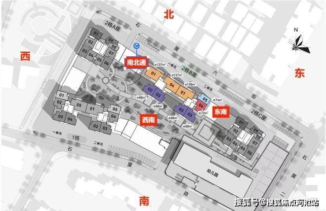 项目总占地约2.1万㎡,由4栋塔楼和1个幼儿园组成,采用围合式布局。目前推售的是位于社区正中央的2栋B座,共235套房源。