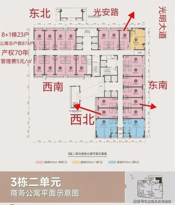 (41㎡单间760套、55㎡一房38套、70㎡两房76套)