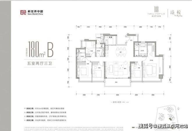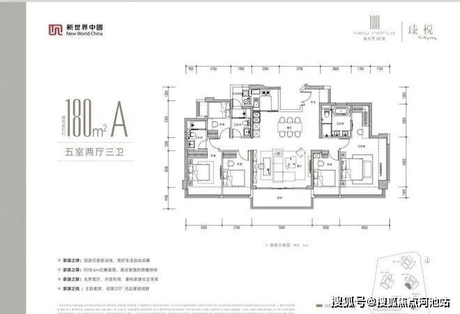 180㎡的5房2厅3卫,设计的是竖厅双龙抱珠格局,客厅5.5米开间,LDKB一体化设计,五开间朝南,约18.6米巨幕面宽,双主卧套间,分别做到了主卧30.5㎡/次卧15.45㎡/次卧11.75㎡/次卧10.87㎡/次卧8.5㎡(包含墙体飘窗),U型厨房,公卫带1个生活阳台约3.89平,阳台约10.73㎡西南朝向。