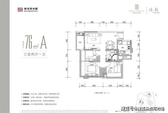 76㎡的3房2厅1卫,设计的是竖厅格局,客厅3.3米开间,LDKB一体化设计,动静分区,分别做到了主卧12.3㎡/次卧11.02㎡/次卧8.28㎡(包含墙体飘窗),U型厨房,卫生间干湿分离,同时带1个设备阳台约1.5㎡,阳台约5.28㎡东北、西北或东南朝向。