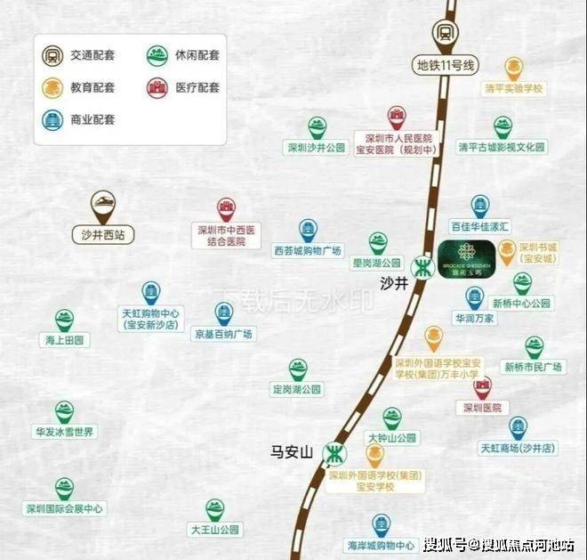 项目还拥有海陆空轨铁六维交通网络,包括广深高速、外环高速等自驾路线。广深高速新桥出口驾车约5分钟可达,外环高速新桥站约10分钟车程,可快速连接福田CBD、宝安机场等核心区域。穗莞深城际沙井西站驾车约10分钟可达,通过公交653路可直达该站,未来穗莞深城际机前段工程建成后,从沙井西站至前海核心区仅需15分钟,实现与广州、东莞的快速连接。