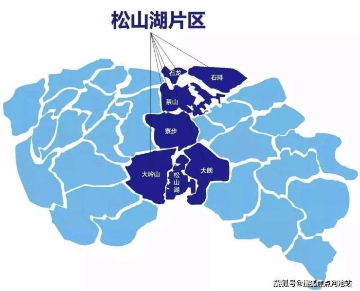 先看地理位置,松山湖位于东莞的中心区域,包括石龙、石排、茶山、寮步、大岭山、大朗六镇。