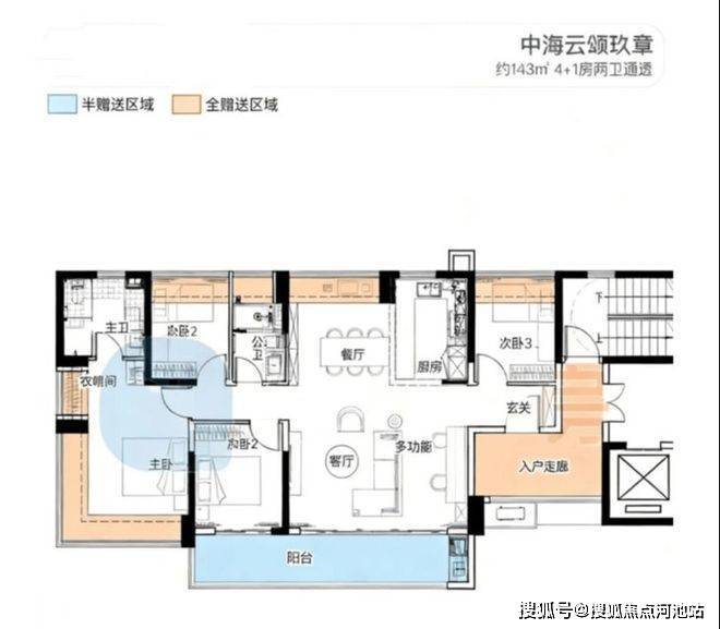 143㎡的4房2厅2卫,设计的是横厅南北通透格局,进门独立入户走廊全赠送,客餐厅分离化设计,横厅大客厅+功能间,五开间朝南,主卧270°无柱转角飘窗+1个次卧朝南,2个次卧朝北向,U型厨房,卫生间干湿分离,得房率约:100%(包含赠送),西南或正南朝向。