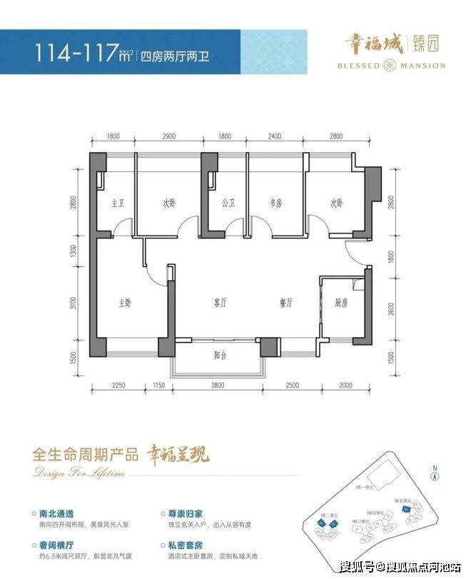 114-117㎡的4房2厅2卫,设计的是横厅南北通透格局,进门入户玄关,客餐厅6.3米开间,LDKB一体化设计,全屋8个飘窗面,4个卧室分别做到了主卧15.35㎡/次卧9.86㎡/次卧9.4㎡/次卧8.16㎡(包含墙体飘窗),U型厨房,卫生间干湿分离,得房率约84.87-87.1%(包含赠送),阳台主朝西南或东南向。