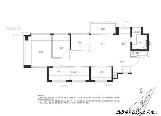 84㎡的3房2厅2卫,设计的是横厅南北通透格局,客厅3.4米开间,LDKG+X空间一体化,动静分区,主卧南北通设计,餐厅位带1个设备平台,U型厨房,卫生间干湿分离,得房率:100%(包含赠送),阳台东北朝向。