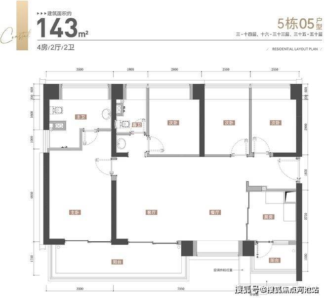建筑面积约143㎡的4房2卫,同样是大横厅的设计,通透采光。客餐厅约7.05米开间,横厅设计,客厅直连观景阳台,餐厅有飘窗,通风采光优越;超7米大开间观景阳台,客厅和次卧阳台直连,极致观景面;主卧超级大衣帽间和卫生间,阔绰舒适主人房;双阳台多飘窗,提高室内使用率。