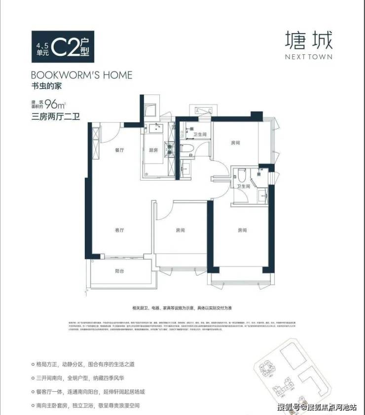 “10.7 m纵深紧凑南向三房”,10.7 m纵深餐客一体,通风采光极佳