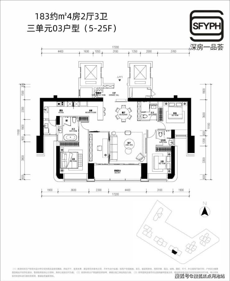 约183㎡4房2厅3卫双套房,分布在三单元03户型5-25楼,专梯入户,中西厨一体化设计