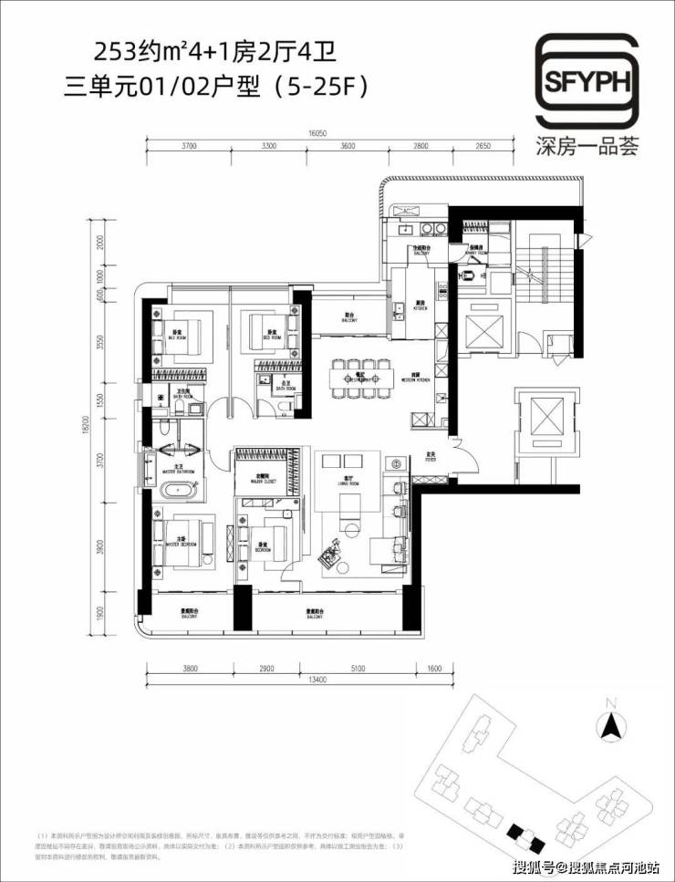 约253㎡4+1房2厅4卫,(分布在三单元01/02户型,5-25楼)南北通透三阳台设计,电梯厅的位置可以利用到
