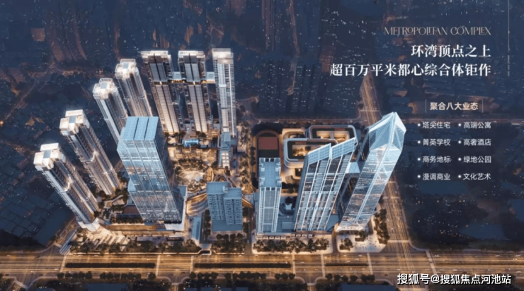 超百万平米的综合体大城,含SHOPPING MALL、总部办公、国际顶奢酒店(大湾区首座Gapella(嘉佩乐)、文娱、高端住宅及公寓、学校/幼儿园、公园绿地等超多元的八大业态。