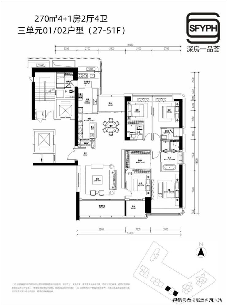 约270㎡4+1房2厅4卫,(分布在三单元01/02户型,27-51楼,高楼层海景好)253㎡户型放大版,适合追求空间感群体