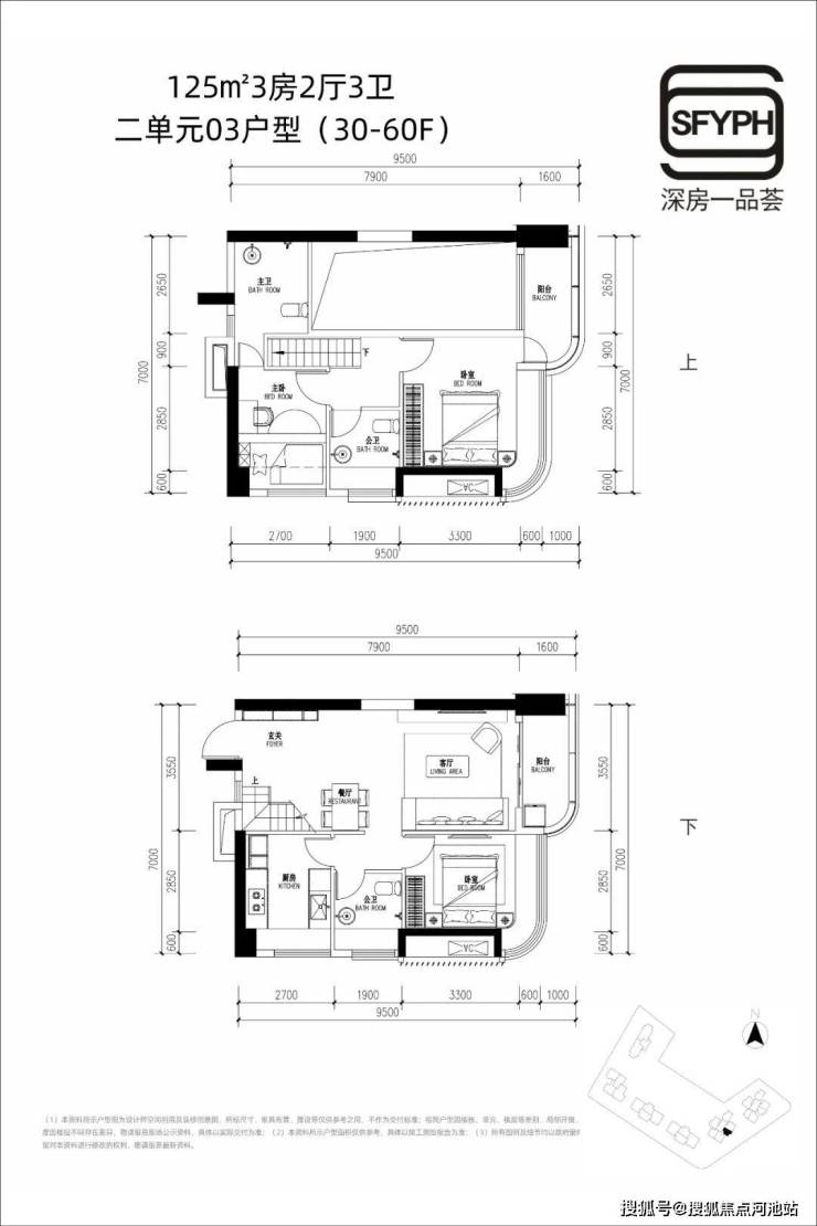 约125㎡3房2厅3卫(标准层高复式户型)分布在二单元03户型30-60楼