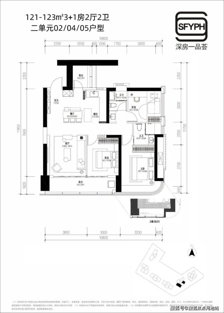 约121-123㎡3+1房2厅2卫,分布在02/04/05户型,三个卧室都中规中矩,小阳台外侧是花池直接可以使用到,测算后小阳台+花池接近有4㎡,做成书房使用足够了