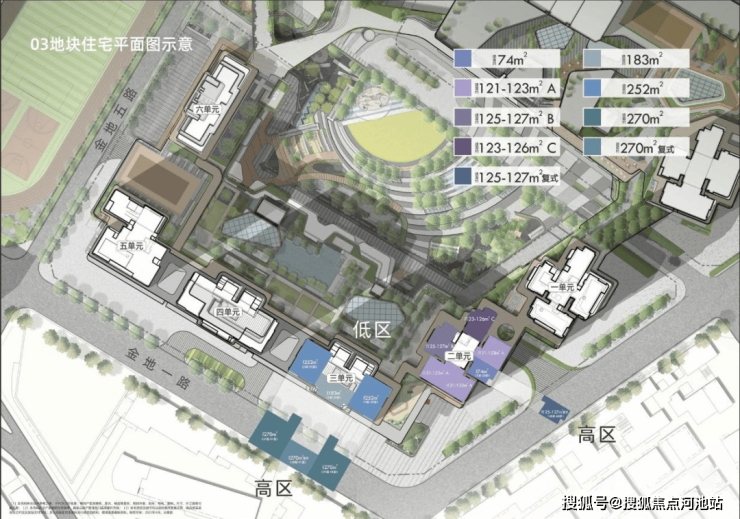 金地环湾城03地块由4栋住宅和2栋公寓组成,占地面积 21889.28㎡,建筑面积约 16.8万㎡,容积率约8-9,车位比1:1.3