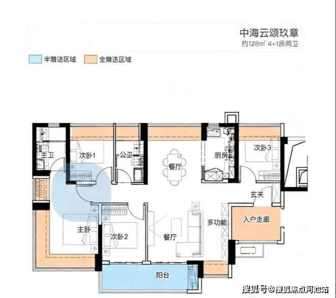 128㎡的4房2厅2卫,设计的是横厅南北通透格局,进门独立入户走廊全赠送,客餐厅分离化设计,横厅大客厅+功能间,五开间朝南,主卧270°无柱转角飘窗+1个次卧朝南,2个次卧朝北向,U型厨房,卫生间干湿分离,得房率约:100%(包含赠送),西南或东南朝向。