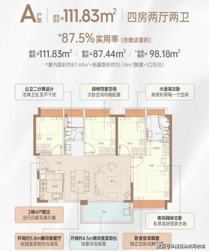 111㎡四房两卫:南北通透横厅设计,5.85米大开间客餐厅,主卧带独立衣帽间和卫浴,适合二胎家庭或三代同堂。