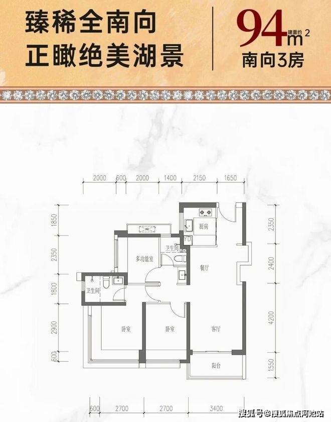 94㎡的3房2厅2卫,设计的是经典竖厅格局,客厅3.4米开间,LDKB一体化,S墙设计预留冰箱卡槽位,动静分区,三开间朝南,分别做到了主卧13.55㎡/次卧9.45㎡/次卧7.28㎡(包含墙体飘窗),U型厨房,公卫三段式干湿分离,得房率约74%(不含赠送),阳台东南朝向约5.27平。套内面积69.94㎡+赠送面积9.65㎡=实得面积79.59㎡,加上赠送后得房率约84.22%。