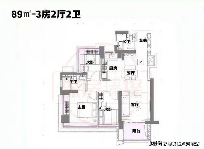 89㎡的3房2厅2卫,设计的是经典竖厅格局,进门入户玄关,S墙设计预留冰箱卡槽位,三开间朝南,主卧+1个次卧270度飘窗,得房率约92%(包含赠送),西南或东南朝向。