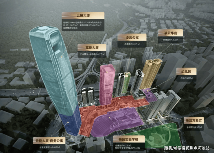 综合体具体包含高端商务写字楼(云投大厦)、研发办公楼(高投大厦研发办公楼)、商务公寓、云端住宅(凌云华府)、华润万象汇商业、配建幼儿园,以及坐拥家门口九年制学校。