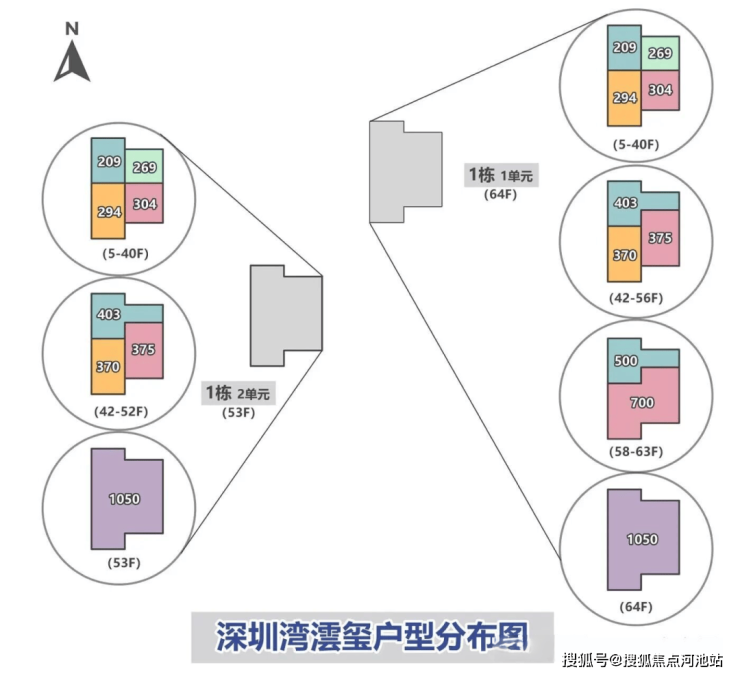 预计项目首推北区1栋(63F)和2栋(52F)约348套,分为高低区设计: